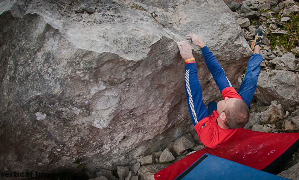 Phil Belcher climber "Pinky Power" V6 at the cuttings boulderfeild.